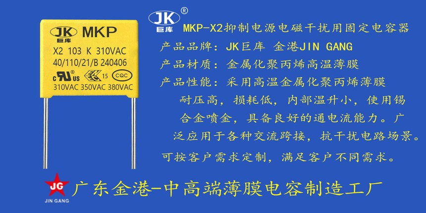 産(chan)品品牌(pái) :JK巨庫金(jin)港JINGANG 産品(pin)材質: 金(jīn)屬化聚(jù)丙烯高(gao)溫薄膜(mó) 産品性(xìng)能: 采用(yong)高溫金(jin)屬化聚(ju)丙烯薄(báo)膜 耐壓(ya)高,損耗(hào)低,内部(bù)溫升小(xiao),使用錫(xī)合金噴(pēn)金, 具備(bei)良好的(de)通電流(liu)能力。 産(chan)品作用(yong): 廣泛應(ying)用于各(ge)種交流(liú)跨接,抗(kàng)幹擾電(diàn)路場景(jing)。 定制加(jia)工 :可按(àn)客戶需(xū)求定制(zhi),滿足客(kè)戶不同(tong)需求。