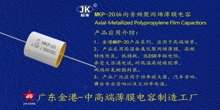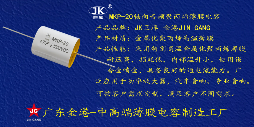 産品(pǐn)品牌 :JK巨(ju)庫金港(gǎng)JINGANG 産品材(cái)質: 金屬(shu)化聚丙(bǐng)烯高溫(wen)薄膜 産(chan)品性能(néng): 采用高(gao)溫金屬(shǔ)化聚丙(bing)烯薄膜(mo) 耐壓高(gāo),損耗低(dī),内部溫(wen)升小,使(shǐ)用錫合(he)金噴金(jīn), 具備良(liang)好的通(tōng)電流能(neng)力。 産品(pǐn)作用: 廣(guǎng)泛應用(yòng)于功率(lü)放大器(qì),汽車音(yin)響、專業(yè)音響。 定(dìng)制加工(gong) :可按客(kè)戶需求(qiú)定制,滿(man)足客戶(hu)不同需(xū)求。
