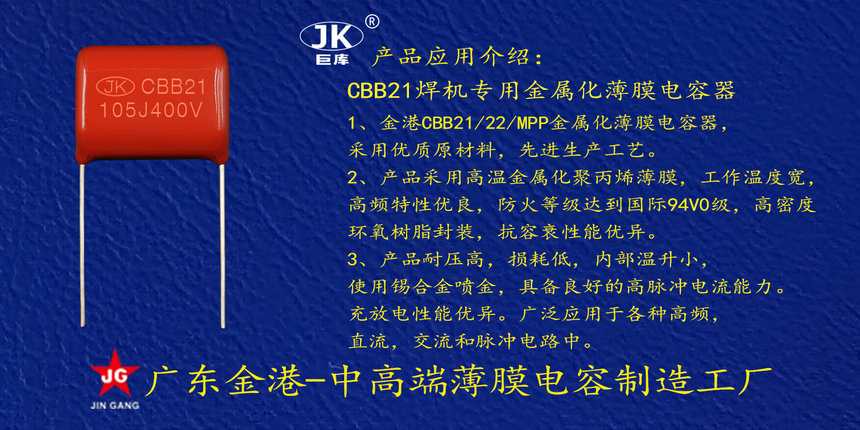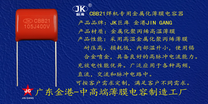 産品(pǐn)品牌 :JK巨(ju)庫金港(gang)JINGANG 産品材(cái)質: 金屬(shu)化聚丙(bǐng)烯高溫(wen)薄膜 産(chǎn)品性能(neng): 采用高(gao)溫金屬(shu)化聚丙(bing)烯薄膜(mo) 耐壓高(gāo),損耗低(dī),内部溫(wēn)升小,使(shi)用錫合(he)金噴金(jin), 具備良(liang)好的高(gāo)脈沖電(diàn)流能力(lì)。 産品作(zuo)用: 廣泛(fan)應用于(yu)各種交(jiao)流跨接(jiē),抗幹擾(rǎo)電路場(chang)景。 定制(zhì)加工 :可(kě)按客戶(hu)需求定(dìng)制,滿足(zú)客戶不(bú)同需求(qiu)。