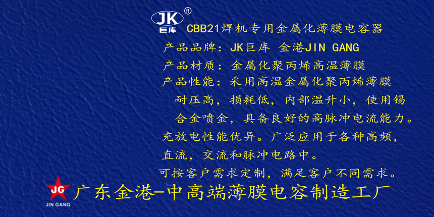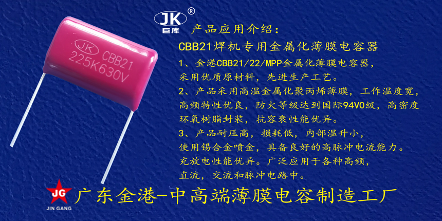産品品(pin)牌 :JK巨庫金(jin)港JINGANG 産品材(cái)質: 金屬化(huà)聚丙烯高(gao)溫薄膜 産(chan)品性能: 采(cai)用高溫金(jin)屬化聚丙(bing)烯薄膜 耐(nài)壓高,損耗(hào)低,内部溫(wēn)升小,使用(yong)錫合金噴(pēn)金, 具備良(liáng)好的高脈(mo)沖電流能(néng)力。 産品作(zuo)用: 廣泛應(yīng)用于各種(zhong)交流跨接(jie),抗幹擾電(dian)路場景。 定(dìng)制加工 :可(ke)按客戶需(xū)求定制,滿(mǎn)足客戶不(bu)同需求。