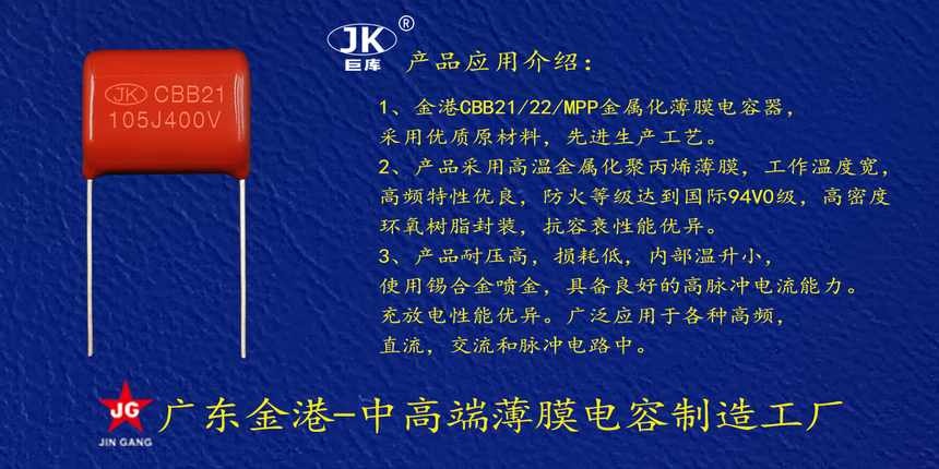 産品品牌(pái) :JK巨庫金港JINGANG 産品(pin)材質: 金屬化聚(ju)丙烯高溫薄膜(mo) 産品性能: 采用(yong)高溫金屬化聚(jù)丙烯薄膜 耐壓(ya)高,損耗低,内部(bù)溫升小,使用錫(xī)合金噴金, 具備(bei)良好的高脈沖(chòng)電流能力充放(fàng)電性能優異。 産(chǎn)品作用: 廣泛應(yīng)用于各種高頻(pin),直流,交流和脈(mò)沖電路中。 定制(zhì)加工 :可按客戶(hù)需求定制,滿足(zú)客戶不同需求(qiú)。