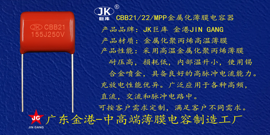 産品(pin)品牌 :JK巨庫(kù)金港JINGANG 産品(pin)材質: 金屬(shǔ)化聚丙烯(xī)高溫薄膜(mó) 産品性能(neng): 采用高溫(wen)金屬化聚(jù)丙烯薄膜(mó) 耐壓高,損(sǔn)耗低,内部(bu)溫升小,使(shǐ)用錫合金(jin)噴金, 具備(bei)良好的高(gāo)脈沖電流(liú)能力充放(fàng)電性能優(yōu)異。 産品作(zuo)用: 廣泛應(yīng)用于各種(zhong)高頻,直流(liú),交流和脈(mò)沖電路中(zhōng)。 定制加工(gong) :可按客戶(hu)需求定制(zhi),滿足客戶(hù)不同需求(qiu)。
