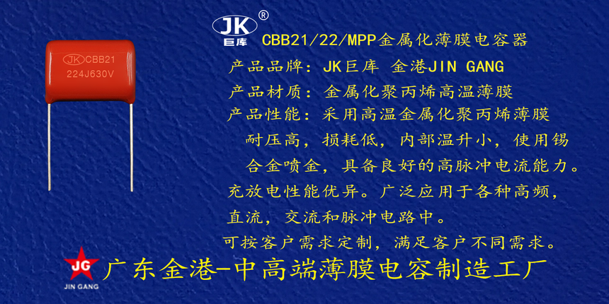産(chan)品品牌(pái) :JK巨庫金(jīn)港JINGANG 産品(pin)材質: 金(jin)屬化聚(ju)丙烯高(gāo)溫薄膜(mó) 産品性(xìng)能: 采用(yòng)高溫金(jīn)屬化聚(jù)丙烯薄(báo)膜 耐壓(yā)高,損耗(hao)低,内部(bù)溫升小(xiǎo),使用錫(xi)合金噴(pēn)金, 具備(bei)良好的(de)高脈沖(chong)電流能(néng)力充放(fàng)電性能(néng)優異。 産(chan)品作用(yong): 廣泛應(yīng)用于各(ge)種高頻(pin),直流,交(jiao)流和脈(mo)沖電路(lù)中。 定制(zhì)加工 :可(kě)按客戶(hu)需求定(dìng)制,滿足(zu)客戶不(bú)同需求(qiú)。