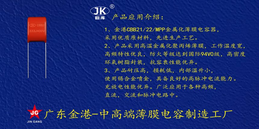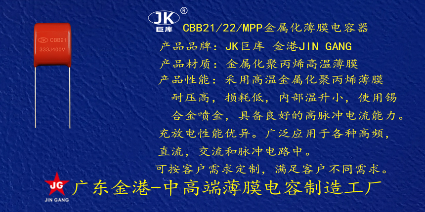 産品品牌(pái) :JK巨庫金港JINGANG 産品(pǐn)材質: 金屬化聚(jù)丙烯高溫薄膜(mó) 産品性能: 采用(yong)高溫金屬化聚(ju)丙烯薄膜 耐壓(ya)高,損耗低,内部(bu)溫升小,使用錫(xī)合金噴金, 具備(bei)良好的高脈沖(chong)電流能力充放(fang)電性能優異。 産(chan)品作用: 廣泛應(ying)用于各種高頻(pín),直流,交流和脈(mò)沖電路中。 定制(zhì)加工 :可按客戶(hù)需求定制,滿足(zu)客戶不同需求(qiú)。
