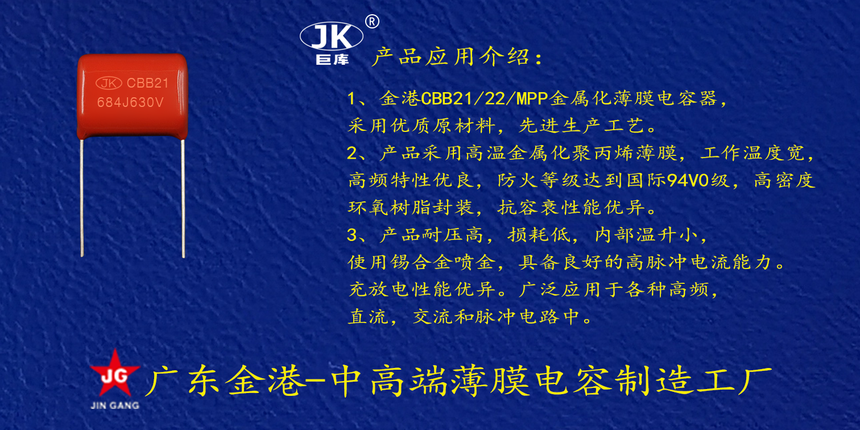産品品(pǐn)牌 :JK巨庫金港JINGANG 産品(pǐn)材質: 金屬化聚丙(bing)烯高溫薄膜 産品(pǐn)性能: 采用高溫金(jīn)屬化聚丙烯薄膜(mo) 耐壓高,損耗低,内(nei)部溫升小,使用錫(xī)合金噴金, 具備良(liang)好的高脈沖電流(liu)能力充放電性能(neng)優異。 産品作用: 廣(guang)泛應用于各種高(gao)頻,直流,交流和脈(mo)沖電路中。 定制加(jia)工 :可按客戶需求(qiú)定制,滿足客戶不(bu)同需求。