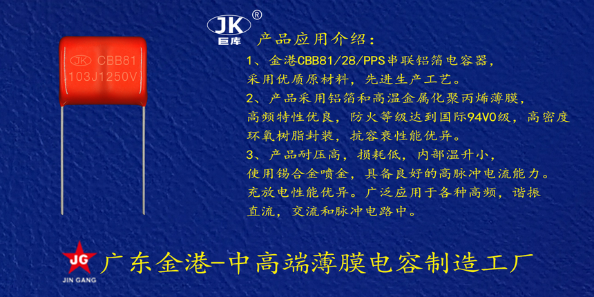 産(chǎn)品品牌 :JK巨庫(ku)金港JINGANG 産品材(cai)質: 金屬化聚(jù)丙烯高溫薄(báo)膜 産品性能(neng): 采用高溫金(jīn)屬化聚丙烯(xi)薄膜 耐壓高(gao),損耗低,内部(bu)溫升小,使用(yong)錫合金噴金(jīn), 具備良好的(de)高脈沖電流(liu)能力,充放電(dian)性能優異。 産(chan)品作用: 廣泛(fan)應用于各種(zhong)高頻諧振,直(zhi)流,交流和脈(mo)沖電路中🔅。 定(ding)制加工 :可按(àn)客戶需求定(ding)制,滿足客戶(hù)不同需求。