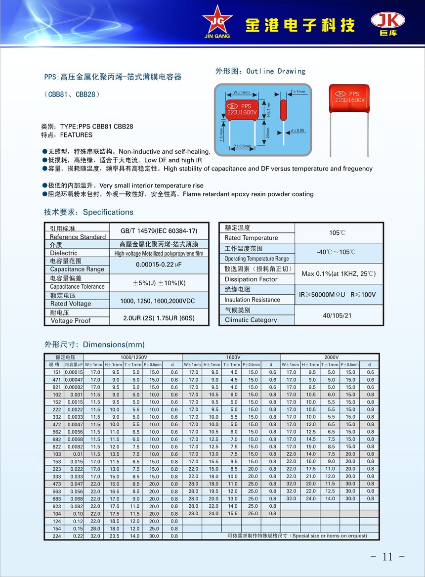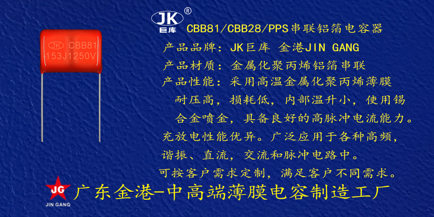 産品(pǐn)品牌 :JK巨(jù)庫金港(gǎng)JINGANG 産品材(cai)質: 金屬(shǔ)化聚丙(bǐng)烯高溫(wēn)薄膜 産(chan)品性能(neng): 采用高(gao)溫金屬(shǔ)化聚丙(bǐng)烯薄膜(mo) 耐壓高(gao),損耗低(dī),内部溫(wēn)升小,使(shi)用錫合(hé)金噴金(jin), 具備良(liáng)好的高(gāo)脈沖電(dian)流能力(li),充放電(diàn)性能優(you)異。 産品(pǐn)作用: 廣(guǎng)泛應用(yòng)于各種(zhǒng)高頻諧(xie)振,直流(liú),交流和(he)脈沖電(diàn)路中。 定(ding)制加工(gōng) :可按客(ke)戶需求(qiú)定制,滿(man)足客戶(hù)不同需(xū)求。
