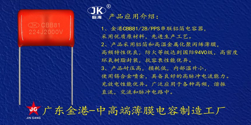 産(chǎn)品品牌 :JK巨庫金港(gǎng)JINGANG 産品材質: 金屬化(hua)聚丙烯高溫薄膜(mo) 産品性能: 采用高(gāo)溫金屬化聚丙烯(xi)薄膜 耐壓高,損耗(hao)低,内部溫升小,使(shi)用錫合金噴金, 具(jù)備良好的高脈沖(chong)電流能力,充放電(diàn)性能優異。 産品作(zuo)用: 廣泛應用于各(ge)種高頻諧振,直流(liú),交流和脈沖電路(lù)中。 定制加工 :可按(àn)客戶需求定制,滿(mǎn)足客戶不同需求(qiú)。