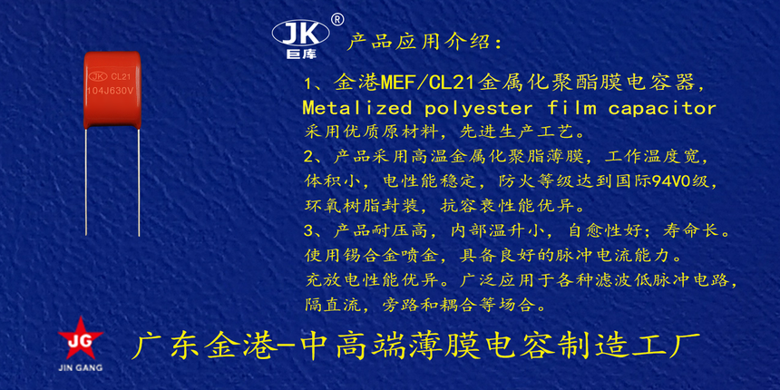 産品(pin)品牌 :JK巨(jù)庫金港(gang)JINGANG 産品材(cai)質: 金屬(shǔ)化聚丙(bǐng)烯高溫(wen)薄膜 産(chǎn)品性能(néng): 采用高(gāo)溫金屬(shǔ)化聚丙(bǐng)烯薄膜(mó) 耐壓高(gao),損耗低(dī),内部溫(wēn)升小,使(shǐ)用錫合(hé)金噴金(jin), 具備良(liáng)好的高(gao)脈沖電(dian)流能力(li),充放電(dian)性能優(yōu)異。 産品(pin)作用: 廣(guǎng)泛應用(yòng)于各種(zhong)隔直流(liú)濾波,低(dī)脈沖電(dian)路,旁路(lù)和🔴耦合(hé)等場合(hé)。 定制加(jiā)工 :可按(an)客戶需(xū)求定制(zhì),滿足客(ke)戶不同(tóng)需求。