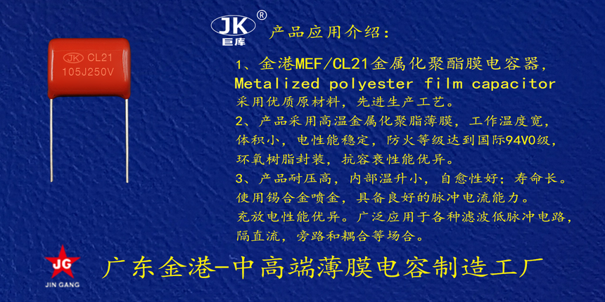 産品品牌(pái) :JK巨庫金港JINGANG 産品材(cai)質: 金屬化聚丙烯(xi)高溫薄膜 産品性(xìng)能: 采用高溫金屬(shu)化聚丙烯薄膜 耐(nai)壓高,損耗低,内部(bu)溫升小,使用錫合(he)金噴金, 具備良好(hao)的高脈沖電流能(néng)力,充放電性能優(you)異。 産品作用: 廣泛(fàn)應用于各種隔直(zhí)流濾波,低脈沖電(dian)路,旁路和耦合等(děng)場合。 定制加工 :可(kě)按客戶需求定制(zhì),滿足客戶不同需(xū)求。