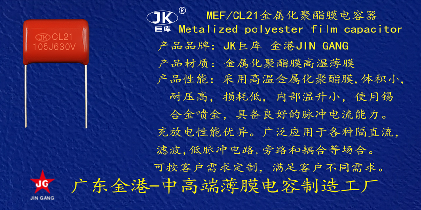 産品品牌(pái) :JK巨庫金港JINGANG 産品材(cai)質: 金屬化聚丙烯(xi)高溫薄膜 産品性(xìng)能: 采用高溫金屬(shu)化聚丙烯薄膜 耐(nai)壓高,損耗低,内部(bu)溫升小,使用錫合(he)金噴金, 具備良好(hao)的高脈沖電流能(néng)力,充放電性能優(you)異。 産品作用: 廣泛(fàn)應用于各種隔直(zhí)流濾波,低脈沖電(dian)路,旁路和耦合⛱️等(děng)場合。 定制加工 :可(kě)按客戶需求定制(zhì),滿足客戶不同需(xū)求。