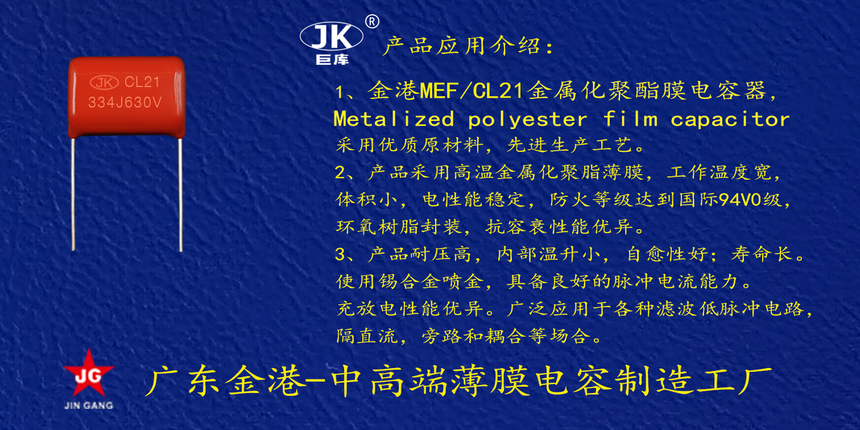 産品品(pǐn)牌 :JK巨庫金(jin)港JINGANG 産品材(cái)質: 金屬化(huà)聚丙烯高(gao)溫薄膜 産(chǎn)品性能: 采(cǎi)用高溫金(jin)屬化聚丙(bing)烯薄膜 耐(nai)壓高,損耗(hao)低,内部溫(wēn)升小,使用(yòng)錫合金噴(pēn)金, 具備良(liáng)好的高脈(mo)沖電流能(néng)力,充放電(dian)性能優異(yi)。 産品作用(yong): 廣泛應用(yong)于各種隔(gé)直流濾波(bō),低脈沖電(diàn)路,旁路和(hé)耦合等場(chǎng)☀️合。 定制加(jiā)工 :可按客(kè)戶需求定(ding)制,滿足客(ke)戶不同需(xu)求。