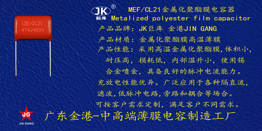 産品品牌(pái) :JK巨庫金港JINGANG 産(chǎn)品材質: 金屬(shǔ)化聚丙烯高(gāo)溫薄膜 産品(pin)性能: 采用高(gāo)溫金屬化聚(ju)丙烯薄膜 耐(nai)壓高,損耗低(dī),内部溫升小(xiao),使用錫合金(jin)噴金, 具備良(liang)好的高脈沖(chòng)電流能力,充(chong)放電性能優(yōu)異。 産品作用(yòng): 廣泛應用于(yu)各種隔直流(liú)濾波,低脈沖(chòng)電路,旁路和(he)耦💚合等場合(he)。 定制加工 :可(kě)按客戶需求(qiú)定制,滿足客(ke)戶不同需求(qiú)。