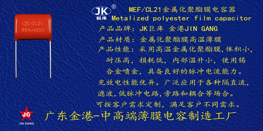 産品品牌 :JK巨(jù)庫金港JINGANG 産品材(cai)質: 金屬化聚丙(bing)烯高溫薄膜 産(chǎn)品性能: 采用高(gāo)溫金屬化聚丙(bǐng)烯薄膜 耐壓高(gao),損耗低,内部溫(wen)升小,使用錫合(hé)金噴金, 具備良(liáng)好的高脈沖電(dian)流能力,充放電(diàn)性能優異。 産品(pin)作用: 廣泛應用(yòng)于各種隔直流(liu)濾波,低脈沖電(diàn)路,旁路和耦合(hé)等場合。 定制加(jiā)工 :可按客戶需(xū)求定制,滿足客(kè)戶不同需求。
