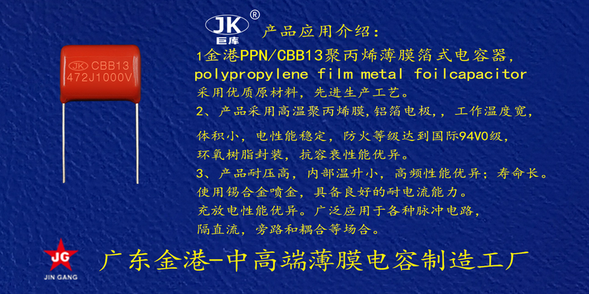 産品品牌(pai) :JK巨庫金港(gang)JINGANG 産品材質(zhi): 鋁箔聚丙(bing)烯膜電容(rong)器 産品性(xing)能: 采用高(gāo)溫聚丙烯(xī)膜,鋁箔電(dian)極耐壓高(gāo), 損耗低,i高(gao)頻條件下(xia)内部溫升(sheng)小錫合金(jīn)噴金, 具備(bèi)良好的耐(nai)電流能力(li)。充放電性(xìng)能優異。 産(chǎn)品作用: 廣(guǎng)泛應用于(yu)各種直流(liú),低脈沖電(diàn)路,等場合(hé)。 定制加工(gōng) :可按客戶(hu)需求定制(zhi),滿足客戶(hu)不同需求(qiú)。
