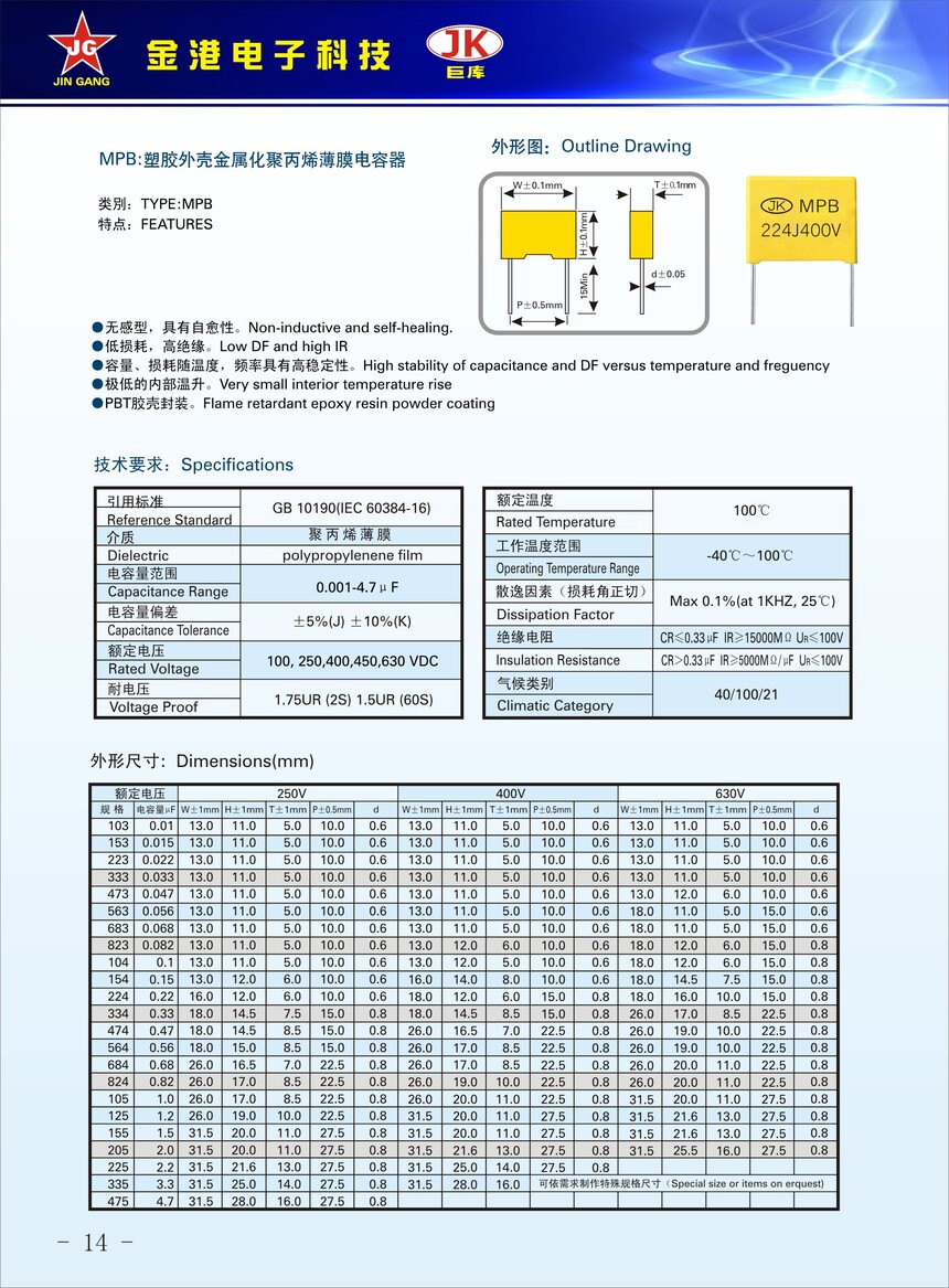 産(chan)品品牌(pai) :JK巨庫金(jīn)港JINGANG 産品(pǐn)材質: 高(gao)溫金屬(shu)化聚丙(bǐng)烯,塑料(liào)外殼封(feng)裝 産品(pǐn)性能: 采(cai)用高溫(wen)金屬化(hua)聚丙烯(xi),耐壓高(gao)産品一(yi)緻性好(hǎo), 損耗低(dī),内部溫(wēn)升小。錫(xī)合金噴(pēn)金, 具備(bei)良好的(de)耐電流(liu)能力。充(chōng)放電性(xing)能優異(yì)。 産品作(zuo)用: 應用(yong)于高壓(yā)高頻脈(mò)沖電路(lù),諧振電(dian)路,等場(chǎng)合。