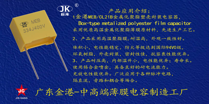 産品品牌(pái) :JK巨庫金港JINGANG 産品(pin)材質: 高溫金屬(shǔ)化聚脂薄膜,塑(sù)料外殼封裝 産(chǎn)品性能: 采用高(gao)溫金屬化聚脂(zhi)薄膜,耐壓高